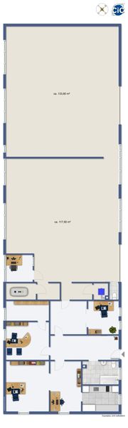 Das Vermietungsobjekt besteht aus zwei Hallen mit jeweils über 110 m², einigen Technik-/Abstellräumen und Büros und Sozialräumen (inkl. Küche, Aufenthaltsraum und Badezimmer).