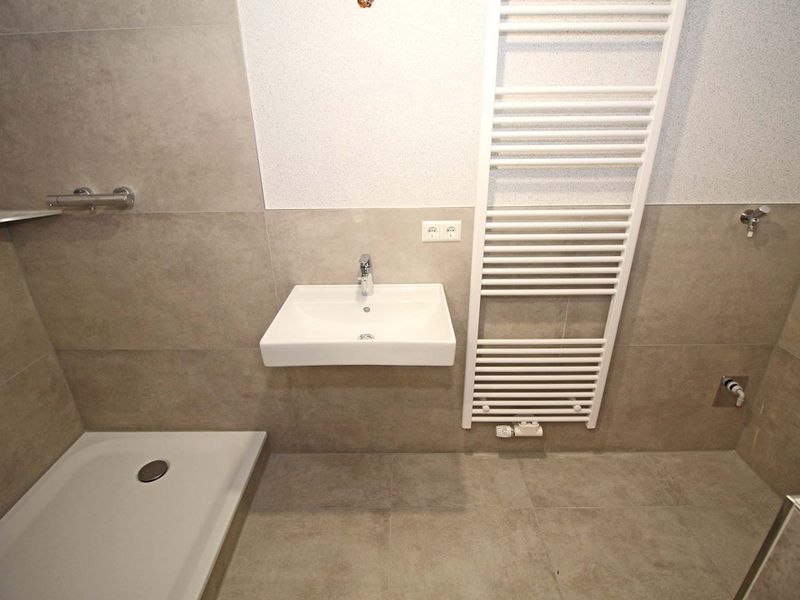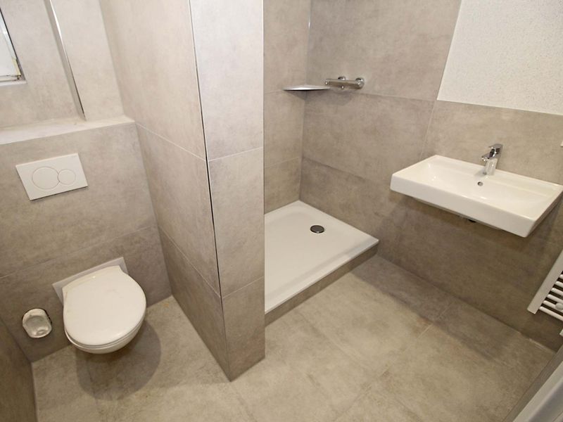 Im Bad ist das WC durch eine Trennwand abgetrennt und seitlich der Wand ist die Dusche angliedert. In diesem separtierten Raumbereich befinden sich das Waschbecken und der komfortable Handtuchheizkörper. Auch wurden Anschlüsse für eine Waschmaschine vorgesehen.