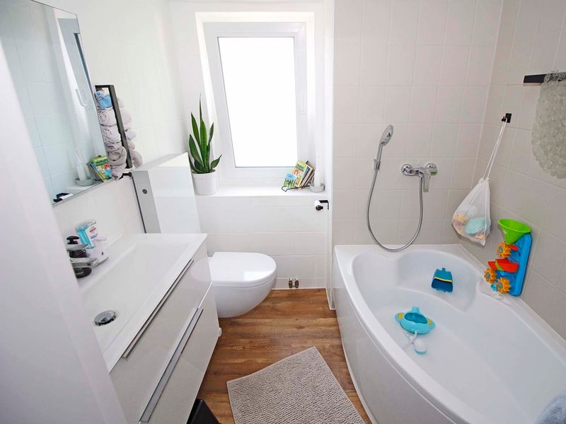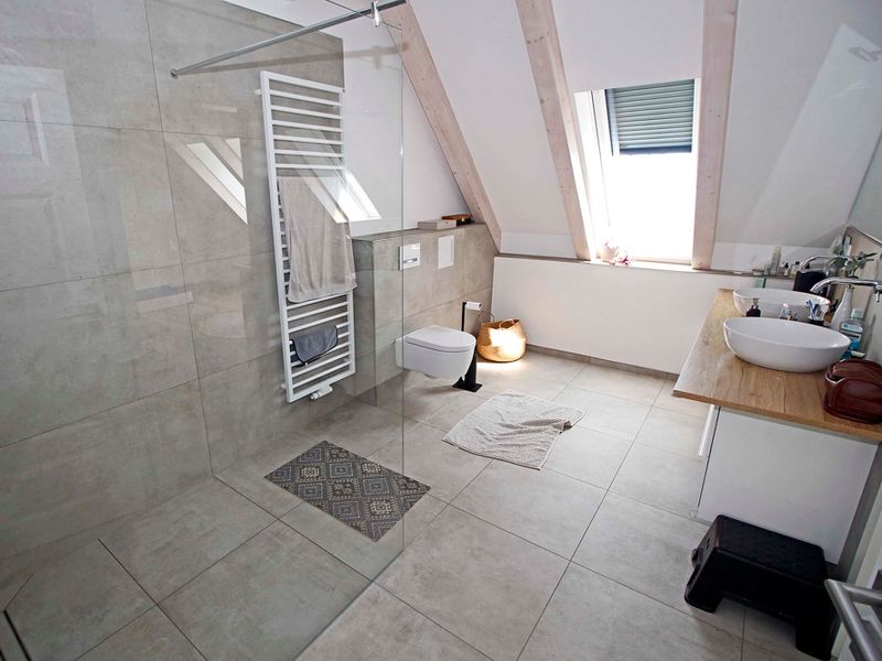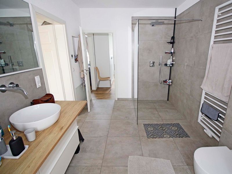 Das Badezimmer im Erdgeschoss, welches an das oben genannte Büro anschließt, wurde noch nicht fertig gestellt und befindet sich somit im Rohbau.