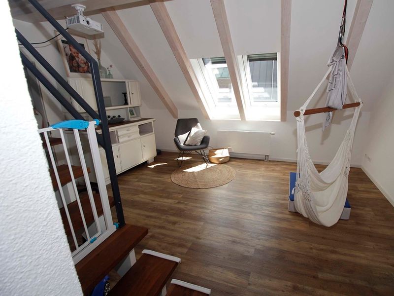 Neben den Wohnräumlichkeiten, die sich über das Ober- & Dachgeschoss erstrecken, befindet sich im Erdgeschoss, abgesehen von den Nutzflächen (Garage, Technik, etc.), ein großes Büro, das vielfältig genutzt werden kann – wie jetzt, als Arbeitsfläche, als zusätzliches Gästezimmer. Vielleicht haben Sie ja noch ganz andere Ideen…