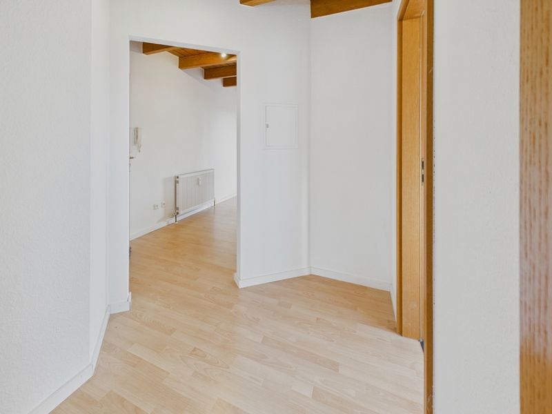 Wie Sie bereits auf den Bildern erkennen können, ist die Wohnung rustikal ausgestattet (z. B. Holzbalkendecke). Die Böden sind größtenteils mit Laminat und die Wände mit Raufasertapete ausgestattet. Küche und Bad hingegen sind neu gefliest.