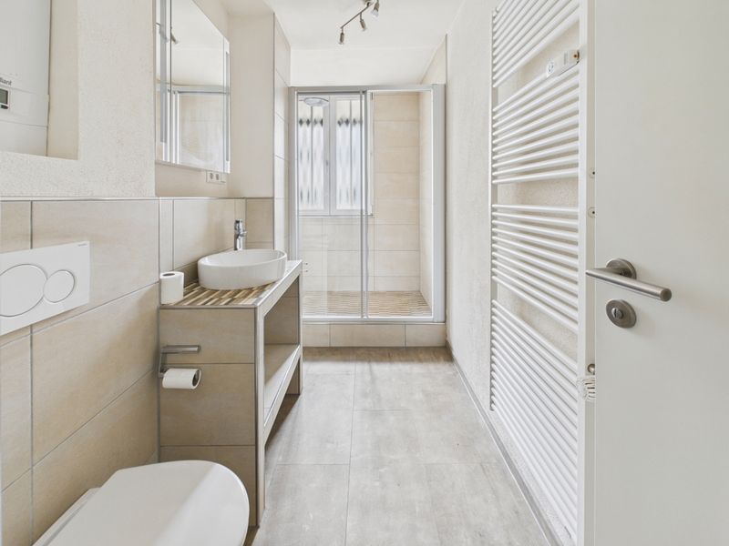 Den neuen Mieter erwartet ein modern gestaltetes Badezimmer mit großzügiger, gemauerter Dusche sowie einen gefliesten Waschtisch mit aufgesetztem Becken. Die Fliesen sind in Erdtönen gehalten.