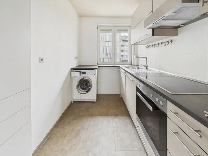 In der Küche kann sich der künftige Mieter auf eine helle Einbauküche mit Induktionskochfeld, Gefrierfach, Kühlschrank mit unterschiedlichen Kältezonen sowie einen Geschirrspüler freuen, ebenso wird eine Waschmaschine zur Verfügung gestellt.
